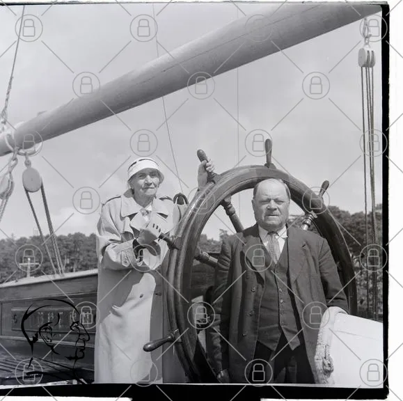 båt, segel, kapten, styrhjul, man, kvinna, historisk, svartvit, kläder, hatt, segling, marin, trä, landskap, himmel, 1900-tal, fotografi, tradition, sjöfart, båtliv, äventyr