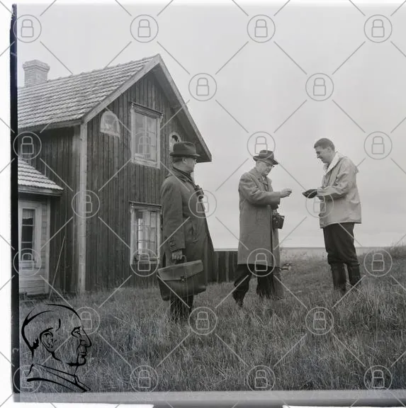 svartvit, foto, tre män, hus, träbyggnad, gräs, hattar, kläder, 1900-tal, landskap, diskussion, utomhus, traditionell, svensk, arkitektur, vintage, historisk, samling, män, stil, natur, miljö, kultur, samhälle, interaktion, grupp, gammal, byggnad, landsbygd