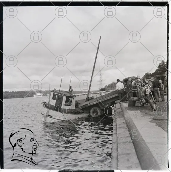 båt, sjö, hamn, människor, olycka, vatten, lastbil, kaj, cykel, svartvit, landskap, transport, fiske, båtliv, natur, himmel, moln, strand, kajplats, båtolycka