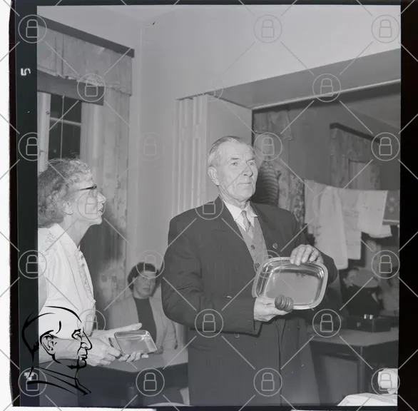 personer, man, kvinna, servering, tallrik, kök, inomhus, kläder, 1950-tal, samling, mat, diskussion, socialt, evenemang, svartvitt, retro, tradition, gemenskap, fest, aktivitet