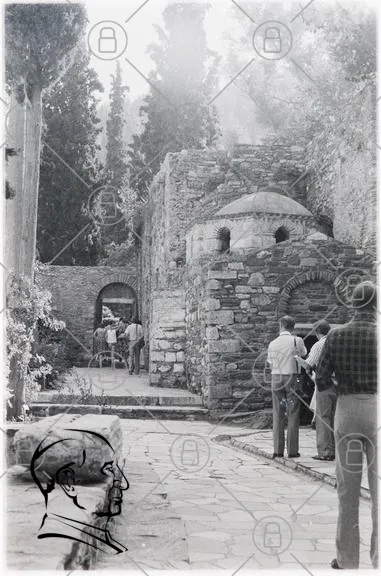 historisk, byggnader, ruiner, sten, trädgård, människor, svartvit, arkitektur, väg, natur, kultur, gammal, monument, turister, landskap, cypern, kloster, historia, fotografering, utforskning, tradition, växtlighet, stenar, gångväg, besökare, avkoppling, lugn, atmosfär, gammal väg, kulturarv