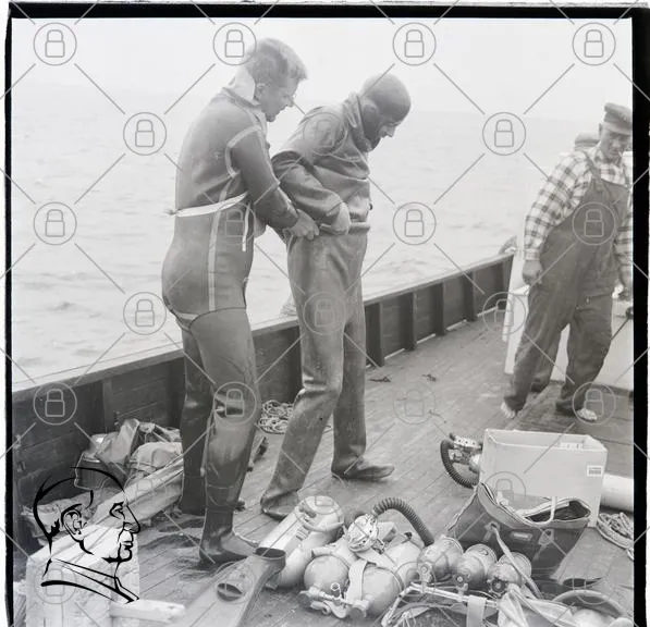 båt, män, sjö, dykning, säkerhet, utrustning, hjälm, räddning, kläder, 1950-tal, svartvitt, arbete, samarbete, hav, fiske, redskap, dykardräkt, båtdekor, vattensport, historia, marina, teamwork, professionell, tradition, mänsklig interaktion, dykare, båtens däck, utrustning på däck, sjöliv