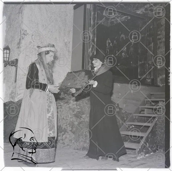 historisk, kläder, kostymer, teater, scen, kvinnor, medeltid, presentation, föreställning, tradition, kultur, svartvitt, dramatik, rekvisita, klädd, kostym, konst, hantverk, stil, uttryck, roll, skådespel, interaktion, miljö, bakgrund, trappa, ljus, skugga, detaljer