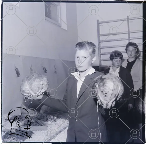 pojke, grönsaker, kål, utställning, skola, 1960-tal, svartvitt, barn, hand, tröja, bakgrund, vägg, fotografi, tradition, jordbruk, skördefest, ungdomar, samarbete, natur, mat