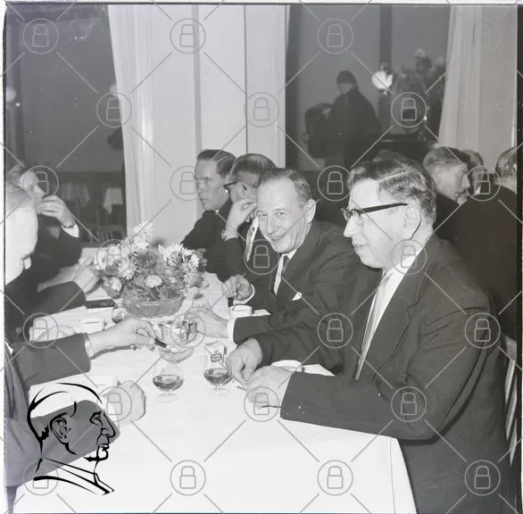 middag, män, bord, blommor, glas, kaffe, kostymer, samtal, fest, svartvitt, restaurang, sällskap, dukat bord, 1960-tal, affärsmöte, leende, eleganta kläder, socialt, samvaro, mat, dryck, högtidligt, diskussion, nätverkande, tradition, stil, interiör, evenemang, gemenskap, nöje