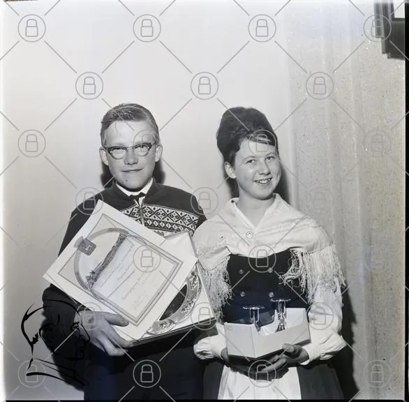 pris, utmärkelse, certifikat, man, kvinna, traditionell klädsel, svartvitt foto, fest, glädje, presentation, trofé, ungdomar, 1960-tal, kultur, firande, porträtt, kläder, leende, hållande, gåva, diplom, bakgrund, inomhus, evenemang, minne, historiskt, samling, festlighet, ungdom, gemenskap, prestation