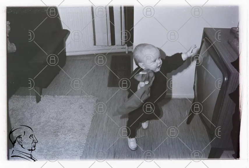 barn, leende, tv, rum, svartvit, inomhus, golv, matta, soffa, kläder, lek, 1960-tal, nostalgi, familj, barndom, skratt, interiör, möbler, barnkläder, aktivitet
