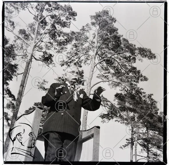 man, talare, utomhus, träd, himmel, kostym, podie, svartvit, skog, natur, gestikulerar, äldre man, barrträd, tal, formell, dagtid, perspektiv, fotografi, historisk, 1900-tal