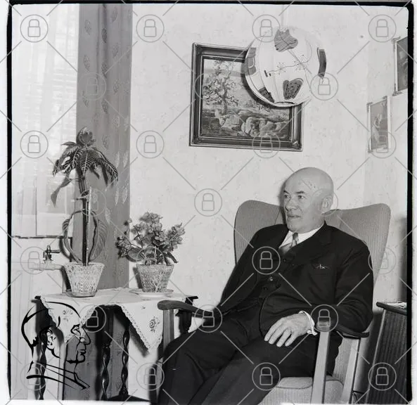 man, kostym, fåtölj, inomhus, växt, tavla, lampa, svartvitt, 1900-tal, möbler, bord, duk, porträtt, heminredning, gammal, stil, kläder, accessoarer, sittande, rum, interiör, traditionell, vintage, elegans, familj, historia, kultur, atmosfär, detaljer, person