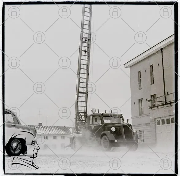 lastbil, brandbil, stege, snö, byggnad, gammal, svartvit, fordon, vinter, 1900-tal, räddning, brandstation, historisk, transport, maskin, teknik, stadsmiljö, fotografering, retro, landskap