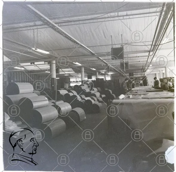 fabrik, produktion, rullar, papper, lager, maskiner, arbetare, industri, golv, tak, belysning, arbetsplats, material, förvaring, arbetsmiljö, svartvit, textil, maskinell, process, hantverk, logistik, utrustning, arbetsflöde, fabrikslokaler, arbetsstationer, rullande, staplar, arbetsredskap, produktionslinje