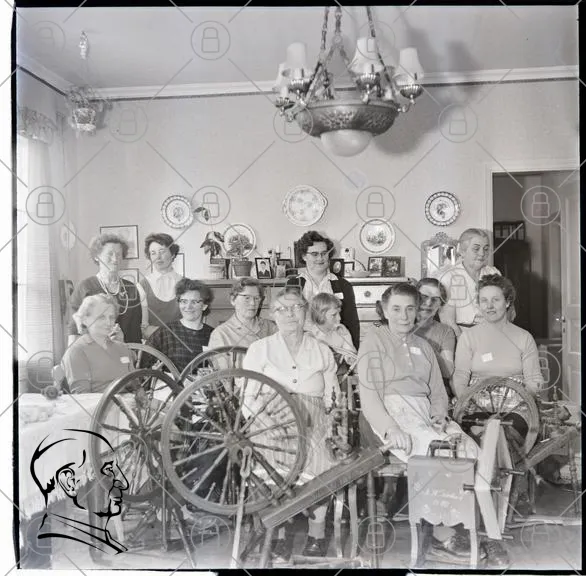kvinnor, spinnrockar, hantverk, gammal bild, inomhus, gruppfoto, traditionellt, handarbete, 1900-tal, samling, hem, kultur, gemenskap, kläder, möbler, dekoration, ljuskrona, bord, stolar, leenden, aktiviteter, familj, historia, nostalgi, svartvitt, fotografi, konst, textil, handarbete, samarbete