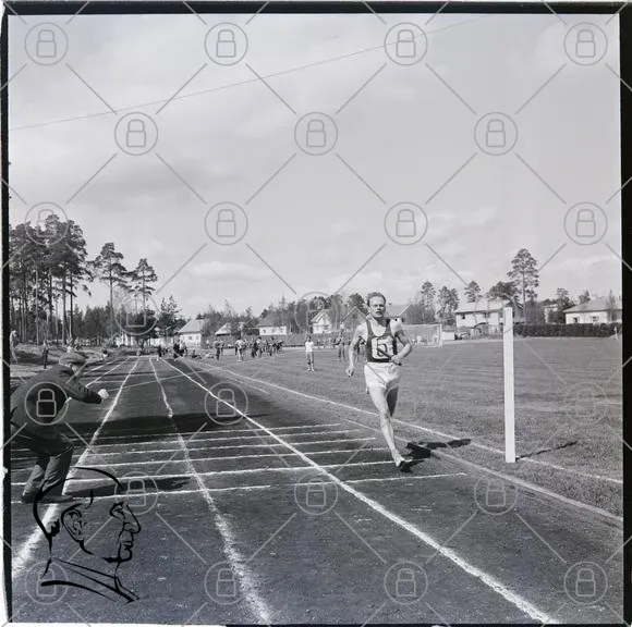 löpare, tävling, idrott, stadion, spår, mål, sport, man, träning, natur, publik, 1960-tal, svartvitt, motion, hastighet, prestation, lopp, gymnastik, utomhus, landskap