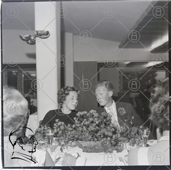 middag, fest, par, bord, dekoration, blommor, glas, klänning, kostym, leende, 1950-tal, svartvit, socialt, samvaro, mat, festlig, elegans, bordsdukning, interiör, människor, samtal, skratt, tradition, festmåltid, stil, vintage, minnen, nöje, gemenskap