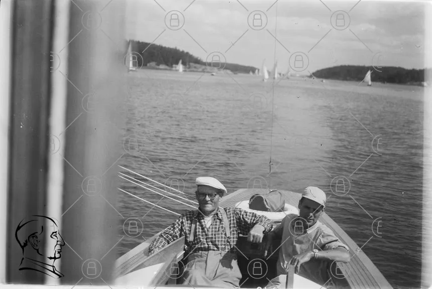 båt, segelbåtar, sjö, män, sommar, vatten, natur, fritid, fotografering, svartvitt, landskap, avkoppling, vänner, utomhus, himmel, sol, ro, tradition, nostalgi, aktivitet, båtliv, kläder, hattar, leende, skärgård, båttur, minnen, gemenskap, lugn