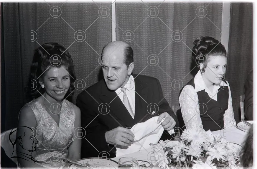 fest, middag, kläder, 1960-tal, svartvitt, bord, blommor, leenden, män, kvinnor, eleganta, sällskap, dukat bord, festligheter, socialt, samvaro, skratt, frisyrer, smycken, servett, glas, tallrikar, mat, bakgrund, tyg, dekorationer, fotografi, minnen, nostalgi, stil