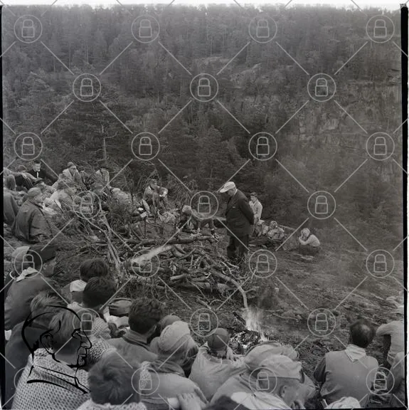 natur, läger, människor, samling, föreläsning, skog, eldstad, kläder, utomhus, trä, berg, aktivitet, grupp, tradition, historia, friluftsliv, camping, utbildning, ledare, lyssna, gemenskap, landskap, svartvit, 1900-tal, kultur, överlevnad, lärande, samarbete, utforskning