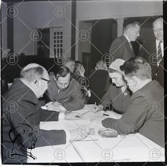 möte, 1950-tal, affärsmän, diskussion, skrivbord, dokument, kostymer, kvinnor, män, svartvitt, konferens, samarbete, noteringar, professionellt, formellt, interaktion, socialt, retro, historiskt, kläder, ansikten, inomhus, grupp, samtal, fokus, detaljer, arbetsmiljö, traditionellt, stil