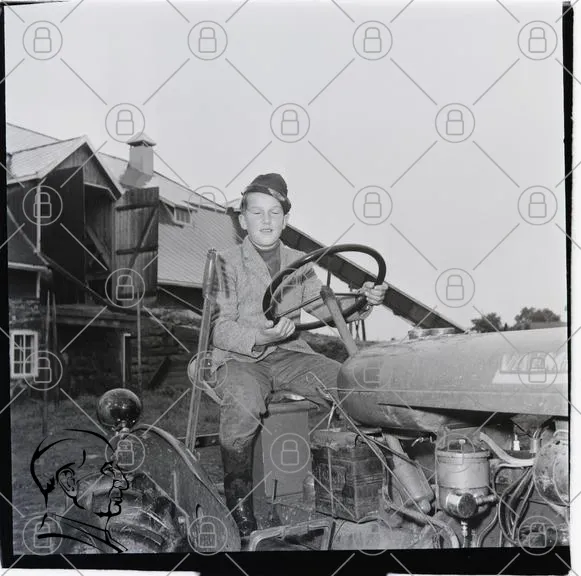 traktor, pojke, bondgård, landsbygd, svartvit, körning, jordbruk, ungdom, maskin, lantbruk, kläder, hatt, fält, byggnader, verktyg, traditionell, landskap, arbete, historia, nostalgi, rural, motor, styrning, fotografering, 1900-tal, barn, utomhus, natur, familj, kultur