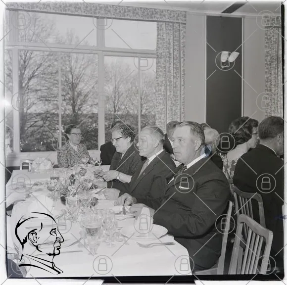 middag, fest, bord, gäster, kläder, dukning, glas, blommor, fönster, 1960-tal, samvaro, samtal, restaurang, eleganta, män, kvinnor, sällskap, mat, servetter, ljus, inredning, socialt, tradition, högtid, stil, evenemang, bakgrund, atmosfär, gemenskap