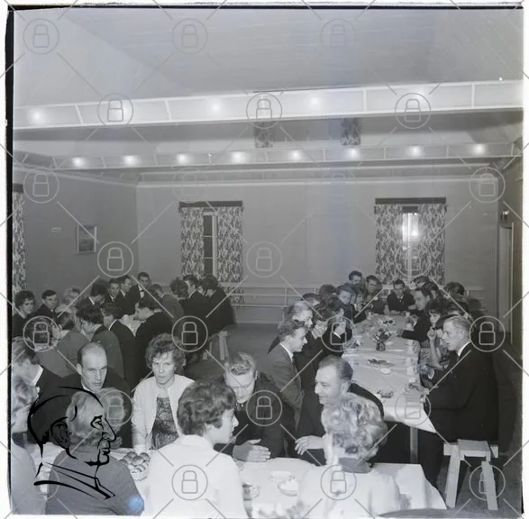 middag, fest, människor, bord, stolar, dukar, fönster, väggar, dekoration, 1960-tal, samvaro, mat, dryck, samtal, socialt, evenemang, svartvitt, inomhus, belysning, kläder, leenden, gemenskap, tradition, festligheter, samling, grupper, aktiviteter, kultur, historia, minnen