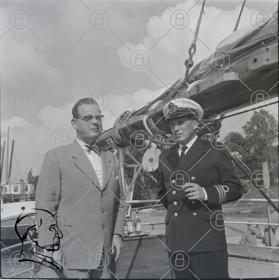 män, kostymer, båt, segling, marin, kapten, sjö, himmel, träd, svartvitt, 1900-tal, möte, uniform, segelbåt, båtliv, stil, tradition, historia, fotografi, porträtt
