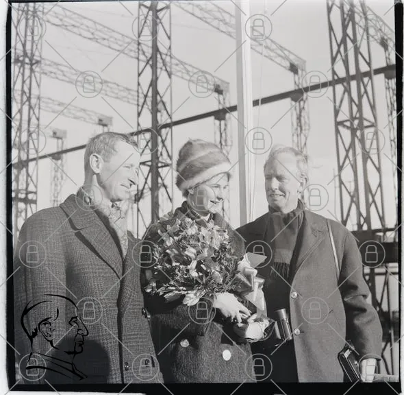 tre personer, blommor, svartvitt, porträtt, utomhus, byggnader, industri, kläder, hatt, leende, 1900-tal, firande, vänskap, fotografi, tradition, skandinavisk, män, kvinna, samling, minne, historia, kultur, fest, glädje, natur, båt, segling, marina