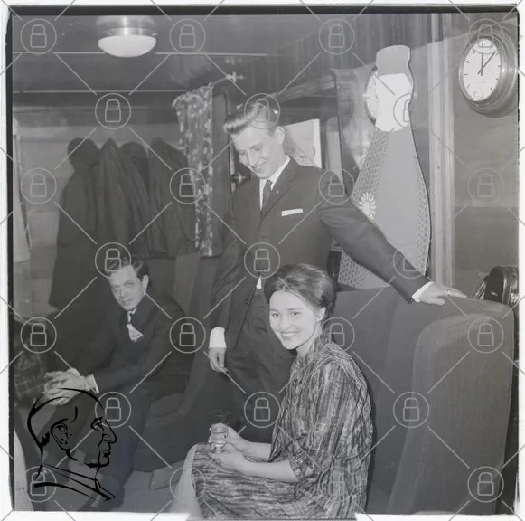svartvitt, foto, 1960-tal, kläder, kostymer, kvinna, man, sittande, stående, inomhus, möbler, soffa, klocka, fest, socialt, retro, stil, glas, interiör, väggar, dräkter, elegans, vintage, skratt, samvaro, klädkod, tidsepok, ansiktsuttryck, klädesplagg