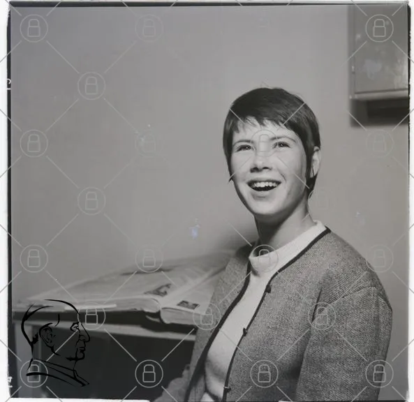 svartvit, kvinna, leende, porträtt, 1960-tal, inomhus, kläder, möbler, bord, tidning, naturligt ljus, ansiktsuttryck, ungdomlig, retro, fotografi, nostalgi, stil, enkelhet, interiör, avslappnad, glad, uttrycksfull, vintage, kultur, minnen, personlighet, charm, atmosfär, livfull