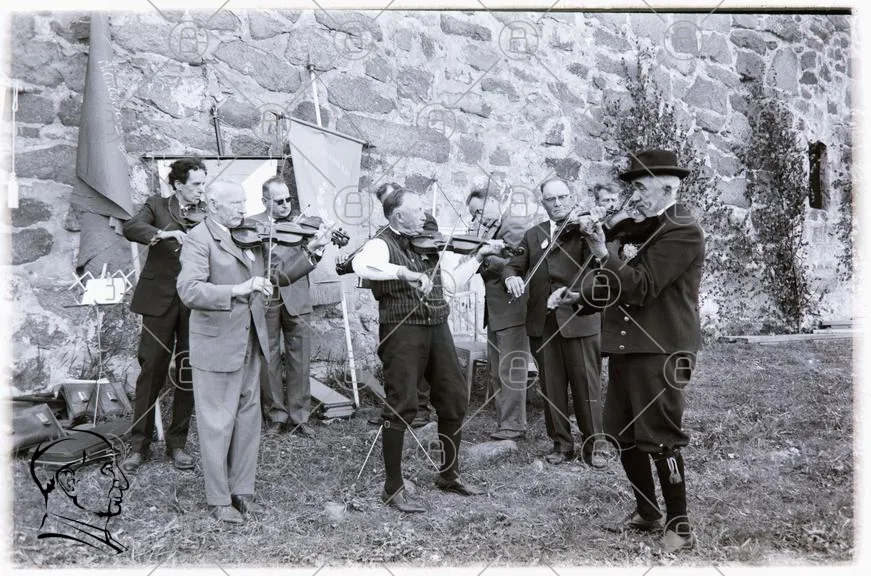 musiker, fiol, spelande, grupp, svartvitt, utomhus, traditionell, kläder, evenemang, folkmusik, uppträdande, män, stenmur, samling, kultur, instrument, fest, gammaldags, folkmusikfestival, musikaliskt, samarbete