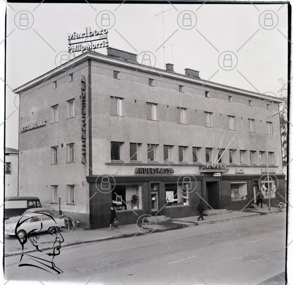 byggnad, hotell, Marlboro, Philip Morris, skylt, 1960-tal, arkitektur, stadsmiljö, gator, människor, bil, fönster, entré, reklam, vintage, svartvitt, fotografi, affär, restaurang, Annelundsgatan, Sverige