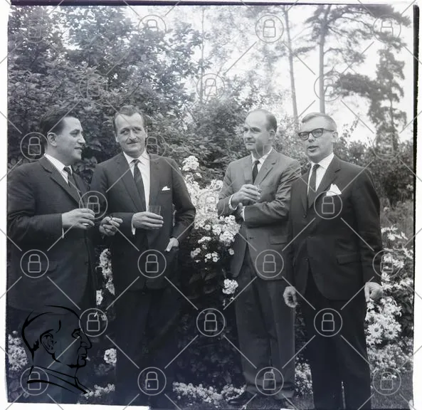 fyra män, kostymer, trädgård, blommor, glas, svartvitt, 1960-tal, formell klädsel, socialt sammanhang, leende, diskussion, vänner, utomhus, stil, elegans, fotografering, samling, män i kostym, kläder, traditionell, festlig, interaktion, bakgrund, natur, stiliga män, vintage, klassisk, sällskap