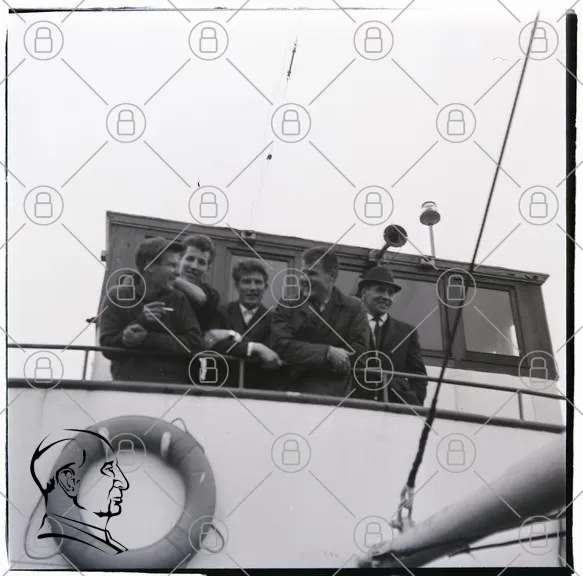 båt, män, pojkar, leende, livboj, sjö, kläder, hatt, fönster, svartvitt, grupp, vänner, nöje, resa, hav, marin, 1960-tal, fotografi, nostalgi, samvaro