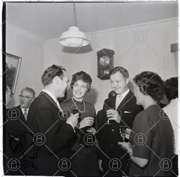 fest, människor, kläder, drinkar, leenden, inomhus, 1960-tal, socialt, samvaro, klocka, väggkonst, eleganta, skratt, par, glas, festligheter, stämning, samtal, kvinnor, män