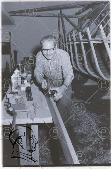 snickare, verkstad, träarbete, verktyg, båtbygge, hantverk, gammal man, glasögon, trä, arbetsbänk, skruvdragare, byggmaterial, hantverksverktyg, träspån, kreativitet, hobby, tradition, manuell arbetskraft, byggprojekt, inomhus, svartvitt, 1900-tal, handarbete, yrkeskunskap, passion, noggrannhet, detaljer, arbetsmiljö, träbearbetning