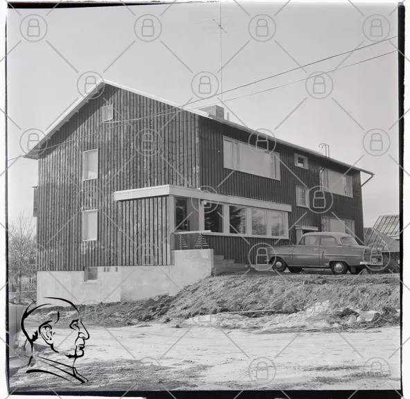 hus, trä, byggnad, fönster, bil, landskap, vinter, asfalt, tak, antenn, gräsmatta, väg, modern, arkitektur, två våningar, garage, svartvitt, 1960-tal, bostad, utomhus