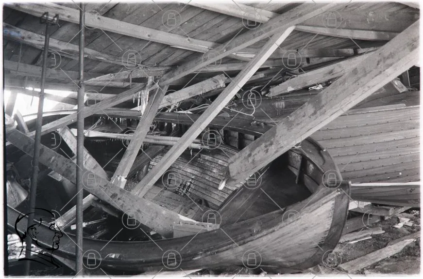 båt, trä, tak, byggnad, is, skador, inredning, gammal, konstruktion, maritim, hantverk, förfall, sjöfart, verktyg, rum, skrov, ribbor, båtverkstad, traditionell, hantverkare, historia, renovering, miljö, natur, stillhet, svartvitt, fotografi, detaljer, struktur, material