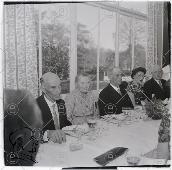 middag, fest, människor, bord, glas, mat, kläder, fönster, trädgård, äldre, samling, samtal, leenden, dukat, sällskap, svartvitt, tradition, högtid, gemenskap, familj