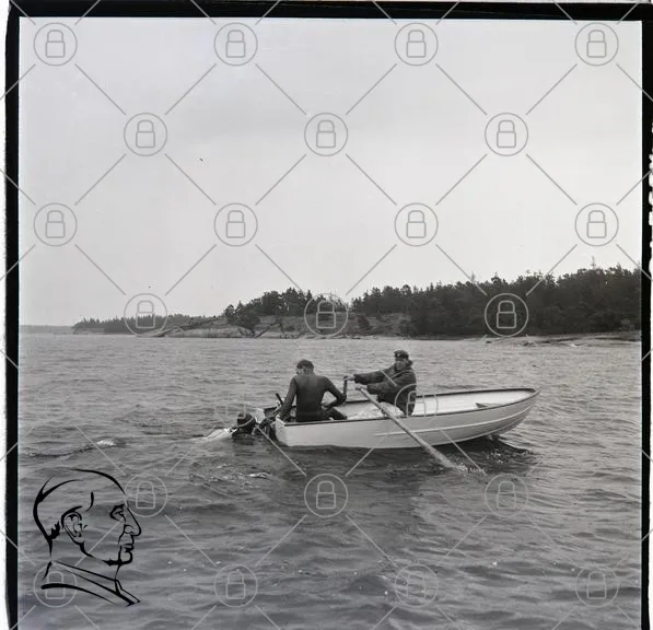 båt, vatten, män, simma, öar, natur, sommar, fiske, rodd, landskap, skärgård, aktivitet, utomhus, avkoppling, tradition, svartvitt, vintage, sport, vänner, nöje