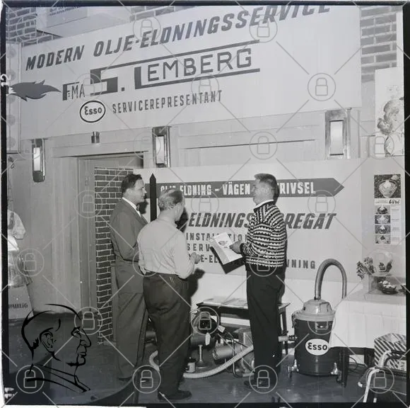 modern, olja, eldningsservice, S. Lemberg, Esso, service, representant, män, diskussion, skyltar, installation, vägledning, service, utrustning, 1950-tal, svartvitt, retro, företag, mässa, teknik, information