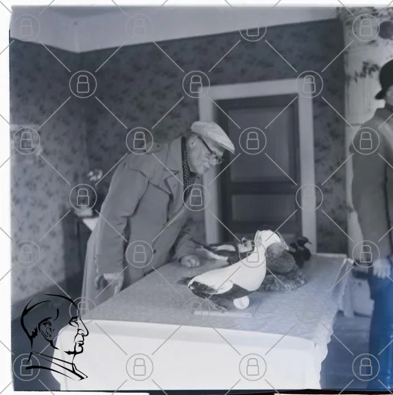 man, fågel, bord, rum, hatt, kläder, inredning, blommor, väggar, svartvitt, observation, intresse, detaljer, gammal, fotografi, stillhet, natur, djur, konst, tradition, kultur, interiör, möbler, skåp, fönster, skulptur, föremål, vintage, nostalgi, historia