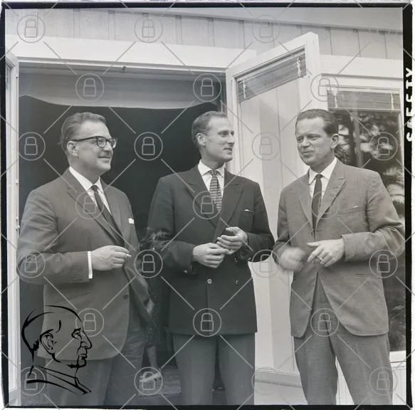män, kostymer, glasögon, möte, utomhus, 1960-tal, svartvitt, affärsmän, diskussion, entré, byggnad, stil, professionell, kläder, vänskap, samarbete, fotografi, grupp, leende, handskakning