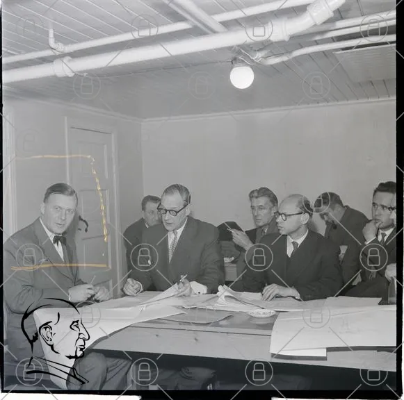 möte, män, skrivbord, papper, planer, diskussion, kontor, 1950-tal, kostymer, glasögon, arkitektur, grupp, inomhus, belysning, dokument, skisser, professionell, samarbete, idéer, teknik