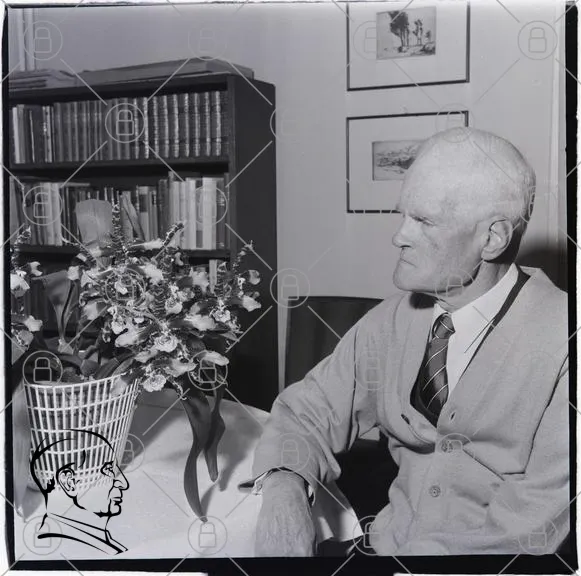 man, äldre, kontor, blommor, bokhylla, svartvitt, kläder, slips, stol, bord, växt, inomhus, eftertänksam, porträtt, stilla, 1900-tal, litteratur, akademisk, interiör, fotografi, traditionell