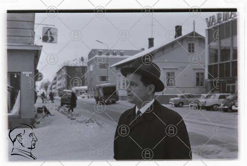 svartvit, man, hatt, kostym, gata, byggnader, snö, 1960-tal, trafik, skylt, bil, vinter, stad, promenad, historisk, fotografi, gammal, stil, människa, landskap, urban, miljö, väg, trottoar, fotgängare, transport, arkitektur, kultur, samhälle, tid