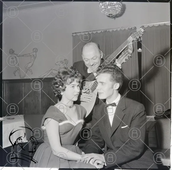 1950-tal, svartvitt, par, musik, gitarr, dans, fest, klänning, kostym, leende, inomhus, retro, ungdomar, bord, dekoration, konst, romantik, underhållning, socialt, nostalgiskt, fotografi, kultur, stil, interiör, sällskap