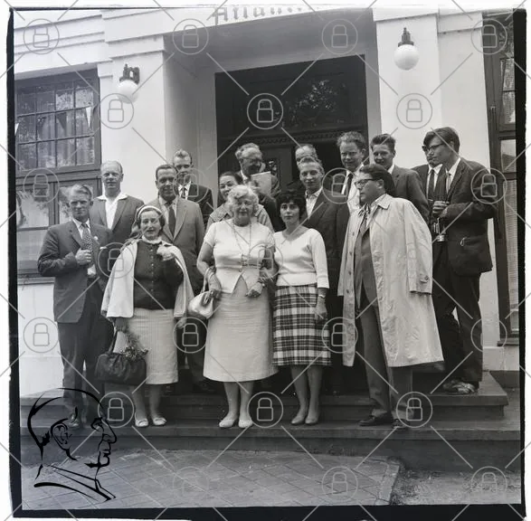 grupp, människor, svartvitt, utomhus, byggnad, kläder, 1960-tal, porträtt, leende, samling, trappa, kvinnor, män, stil, traditionell, fest, social, historisk, fotografi, event, gemenskap, vänskap, kultur, minnen, samarbete, glädje, professionell, formell, samling, presentation