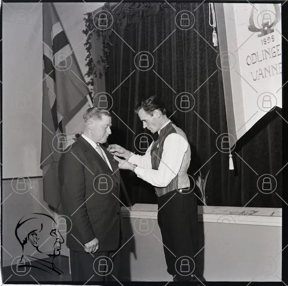 ceremoni, män, kostymer, slips, flaggor, bakgrund, svartvitt, 1935, odling, vannet, fest, utmärkelse, tradition, evenemang, samling, högtid, kläder, prydnad, tal, presentation, socialt, kultur, historia, gemenskap, festlighet, uppvaktning, artighet, respekt, fotografering, minne, festligheter