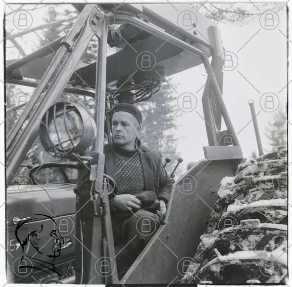 traktor, man, vinter, snö, skog, jordbruk, maskin, arbete, landskap, traditionell, kläder, svartvitt, landsbygd, verktyg, natur, sittande, ansiktsuttryck, gammal, historia, rural, transport, motor, mekanik, jordbrukare, förare, maskinförare, trä, metall, ljus, skugga