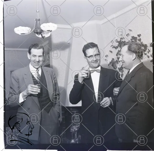 män, kostymer, glas, fest, 1950-tal, svartvitt, leende, inomhus, interiör, vänner, socialt, kläder, stil, elegans, skratt, samvaro, tradition, retro, fotografi, nostalgi, umgänge, mänsklig interaktion, festligheter, gemenskap, affärsmän, cocktail, drinkar, samtal, uttryck